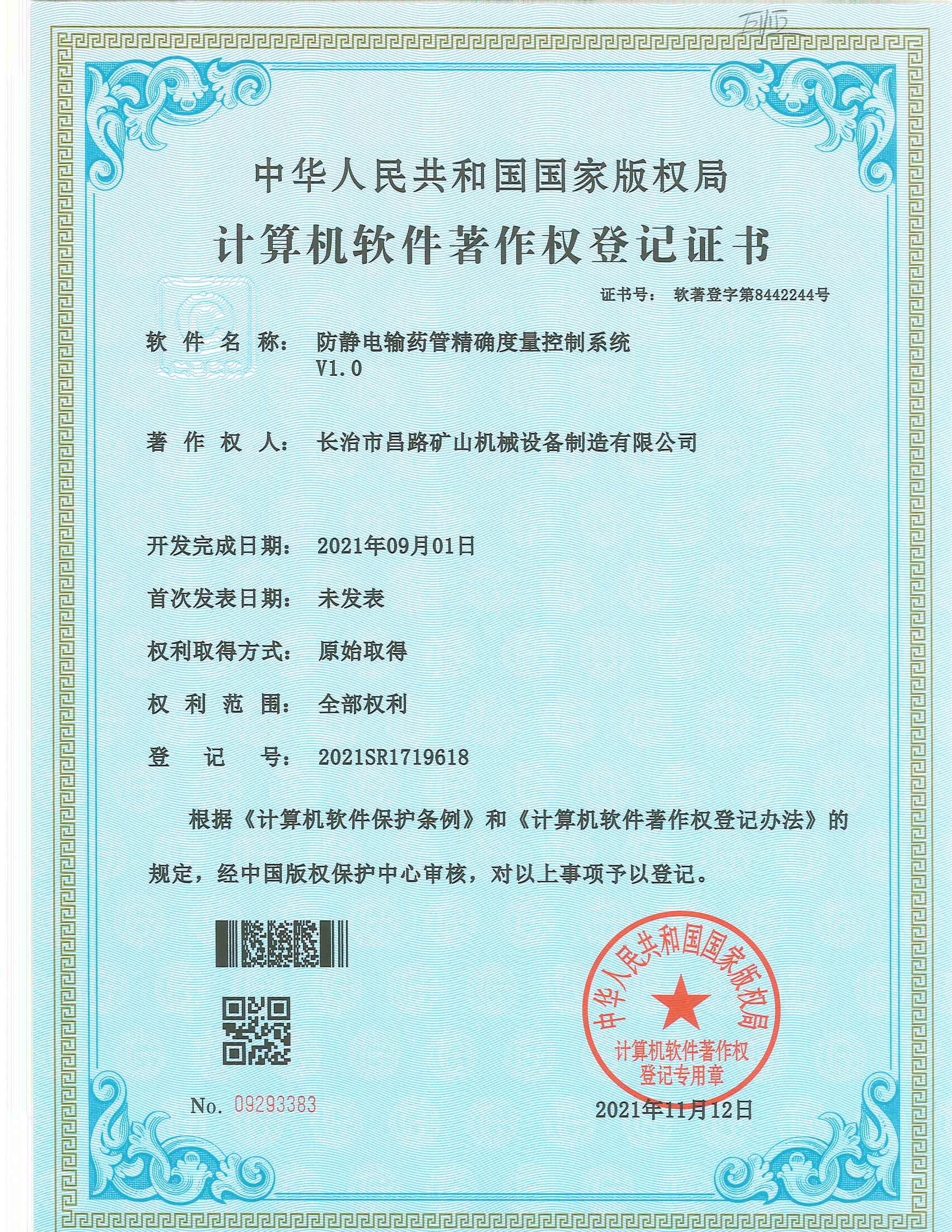 防靜電輸藥管精確量控制系統(tǒng)著作權(quán)登記證書(shū)